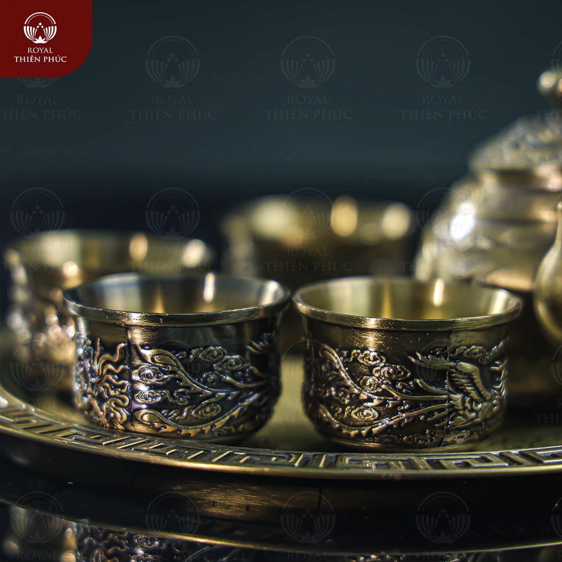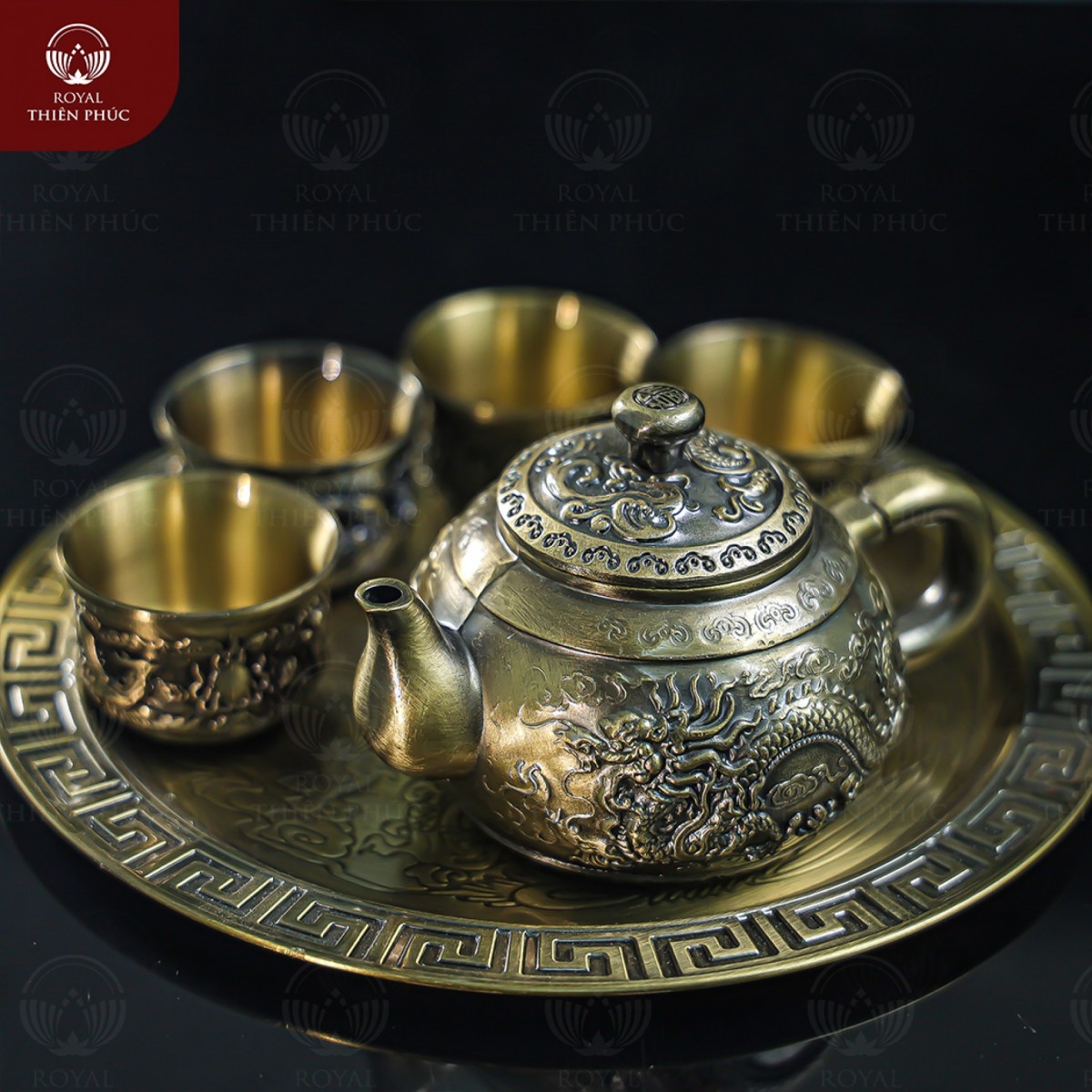 Ấm chén và khay đựng đều được đúc từ đồng vàng. Sau quá trình hun màu giả cổ, chúng sở hữu sắc thái rất đặc biệt.
