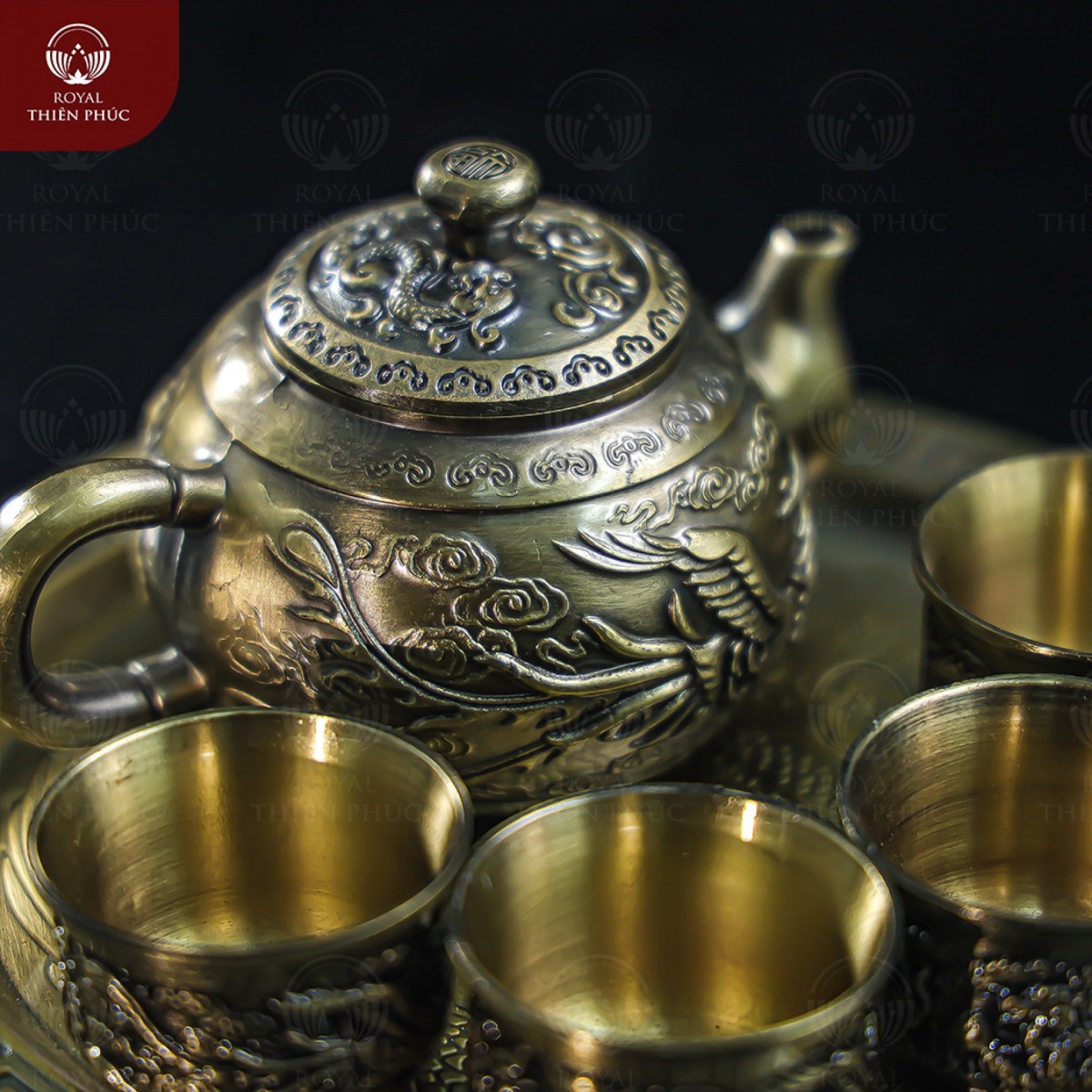 Bộ ấm chén rồng phượng bằng đồng vàng giả cổ nặng 1,1kg