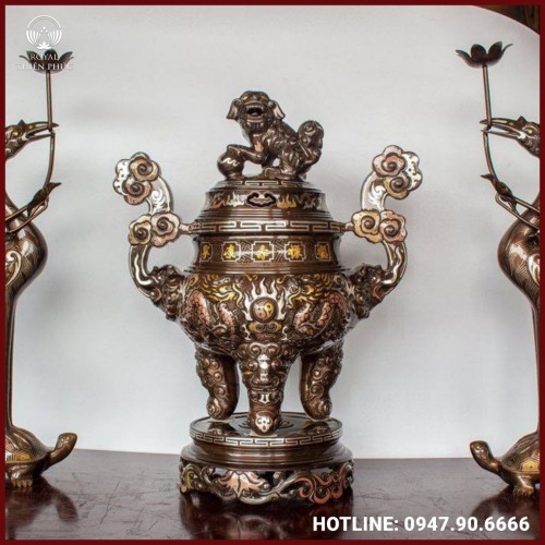 Bộ tam sự hạc chạm song long khảm ngũ sắc là một trong những tác phẩm tiêu biểu của nghệ thuật đúc đồng truyền thống Việt Nam, mang đậm giá trị tâm linh và thẩm mỹ. Đỉnh đồng được tạo dáng vững chãi, đặt trên đế tròn kiên cố, thể hiện sự ổn định và bền vững nền tảng cho sự thịnh vượng và an lành. Thân đỉnh phình rộng, chạm nổi tinh xảo với hình song long chầu nguyệt hai con rồng uốn lượn đối xứng, đầu hướng về viên minh châu, biểu trưng cho quyền uy, phúc khí và sự giao hòa âm dương trong vũ trụ.