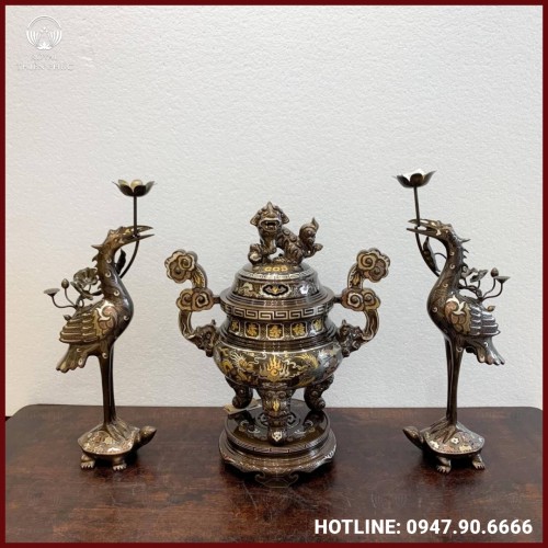 Bộ tam sự bằng đồng khảm tam khí do Đồ đồng Thiên Phúc chế tác là một tác phẩm nghệ thuật mang đậm dấu ấn truyền thống Việt. Sản phẩm gồm một đỉnh đồng đặt ở vị trí trung tâm và hai hạc đứng trên lưng rùa chầu hai bên, tượng trưng cho sự hòa hợp của đất – trời, âm – dương và trường tồn bất diệt.
