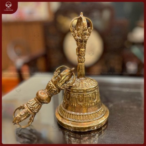 Chuông chày kim cang mang ý nghĩa vô cùng linh thiêng và được rất nhiều gia chủ theo Phật giáo quan tâm. Dưới đây là mẫu sản phẩm Chuông chày kim cang đồng vàng cao 18cm, chày cao 10cm của Đồ đồng Thiên Phúc