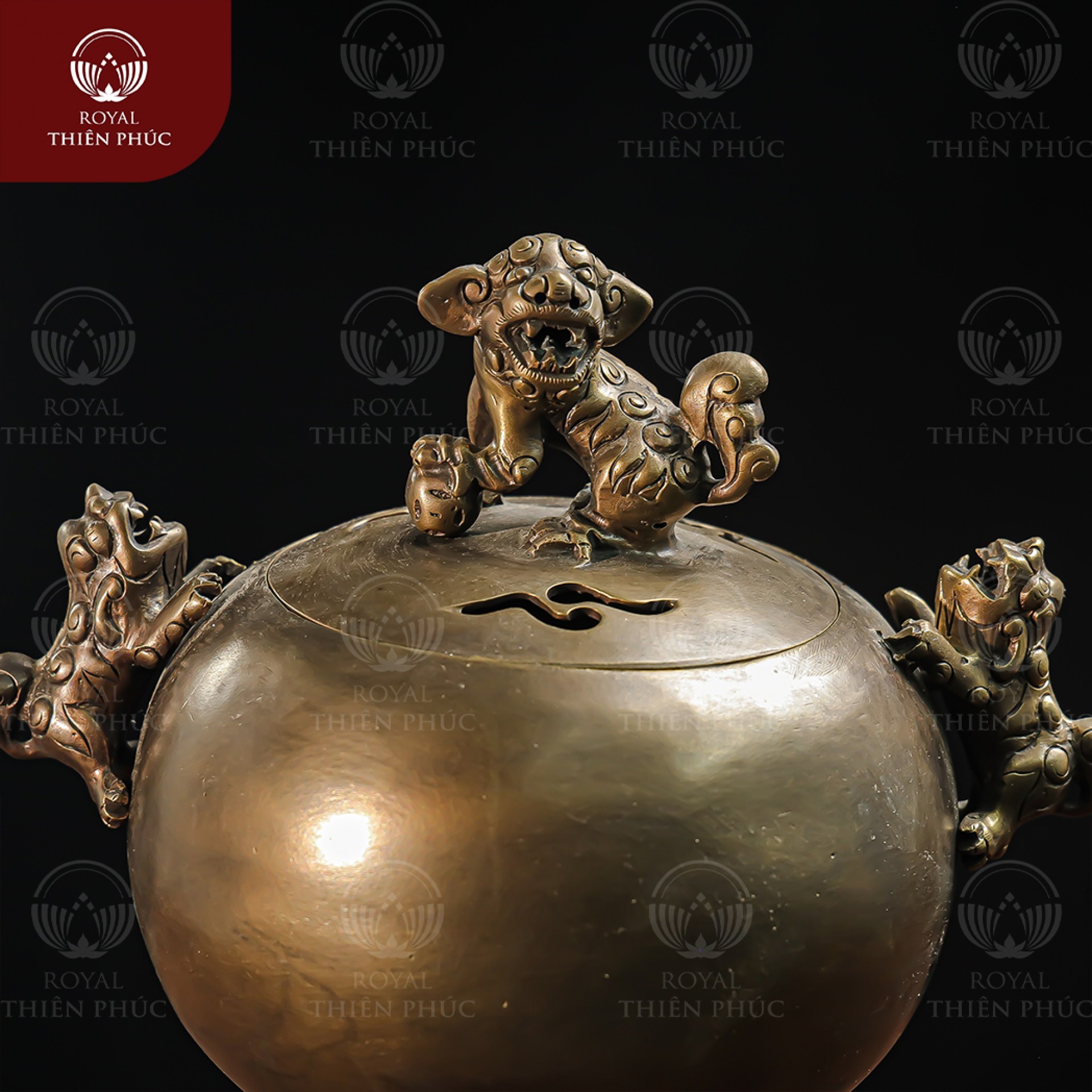 Cấu tạo của sản phẩm rất đặc biệt. Trước hết, các bạn có thể thấy phần nắp và phần thân đỉnh ghép lại thành khối cầu, đường nét tròn trịa. Chúng ăn khớp hoàn hảo, bề mặt được xử lý nhẵn mịn. Với đặc điểm nêu trên, sản phẩm còn được gọi là đỉnh đồng quả bóng. Trên nắp đỉnh có những khe thoáng được chạm rỗng tinh xảo, sắc nét. Chúng uốn lượn, gấp khúc nhịp nhàng và có sự đối xứng với nhau. Ngoài ra, chúng ta cần nhắc đến tượng Lân chúa.