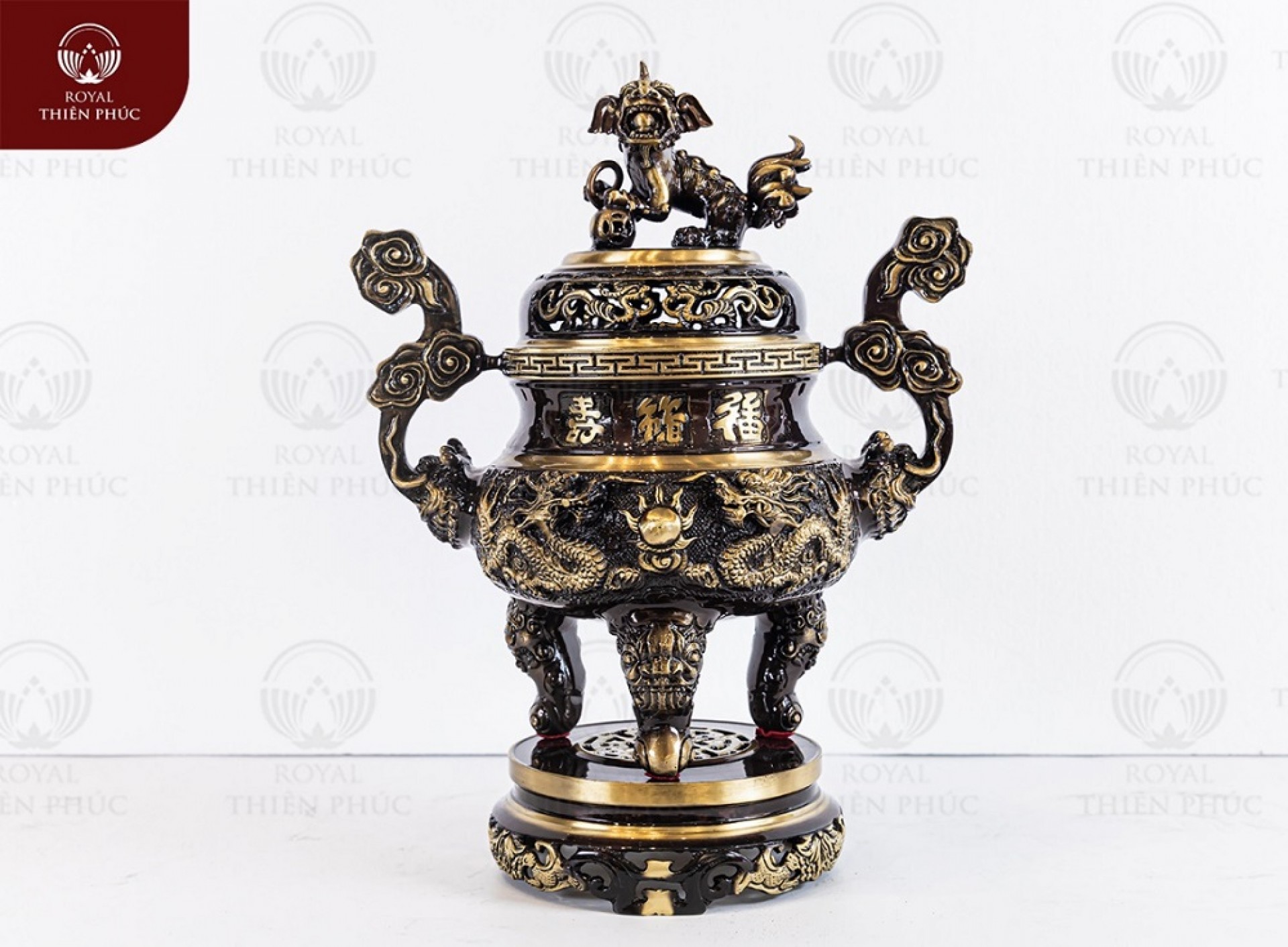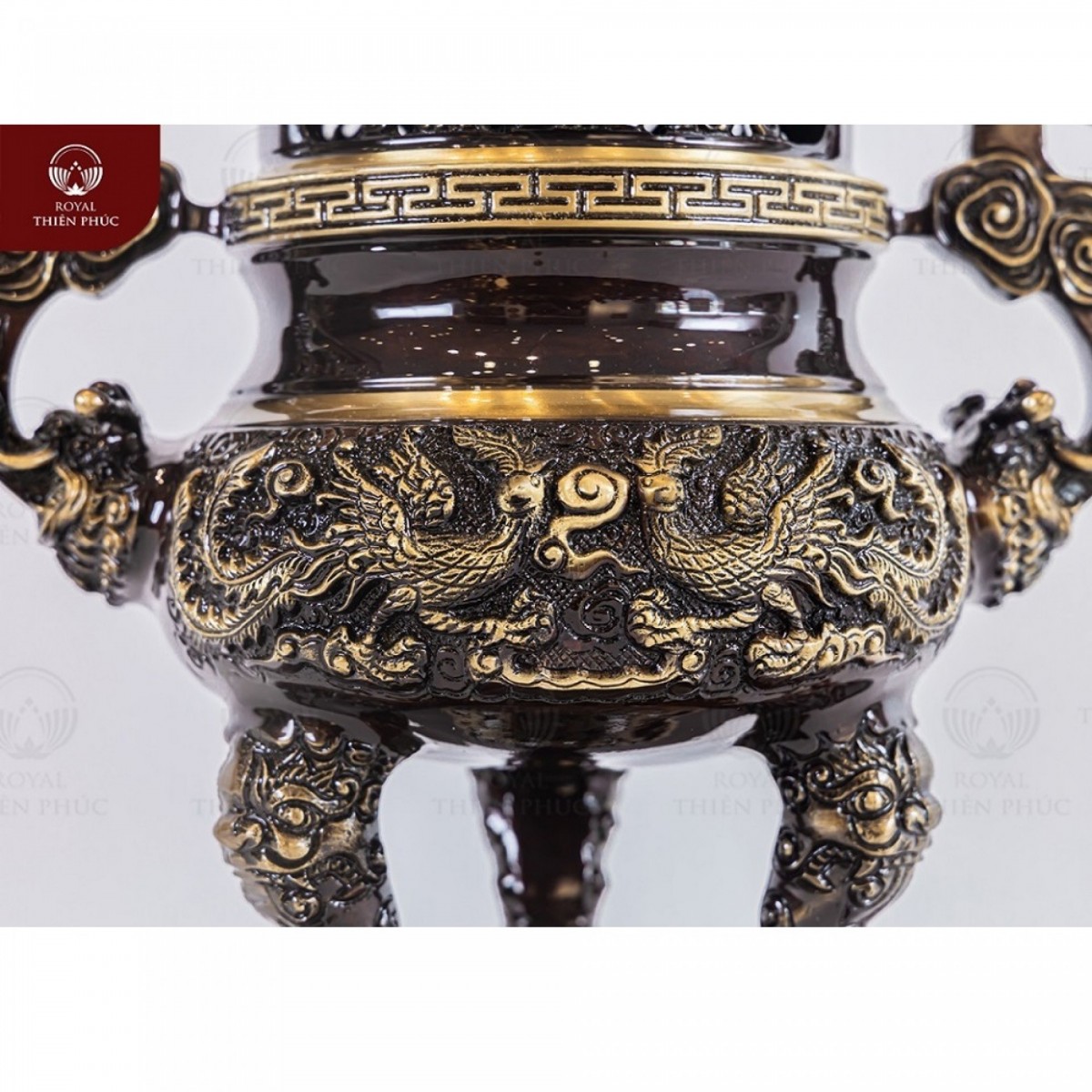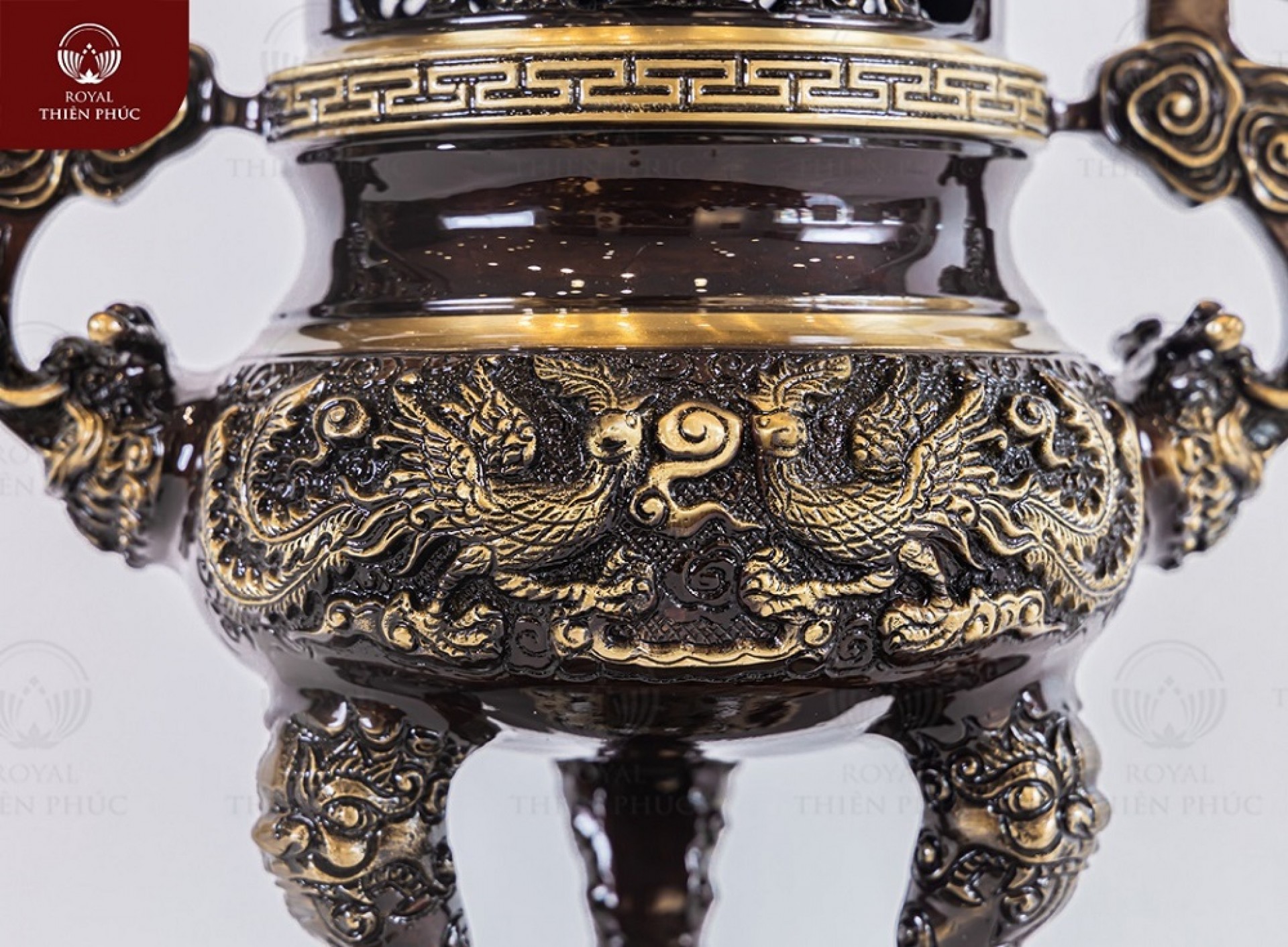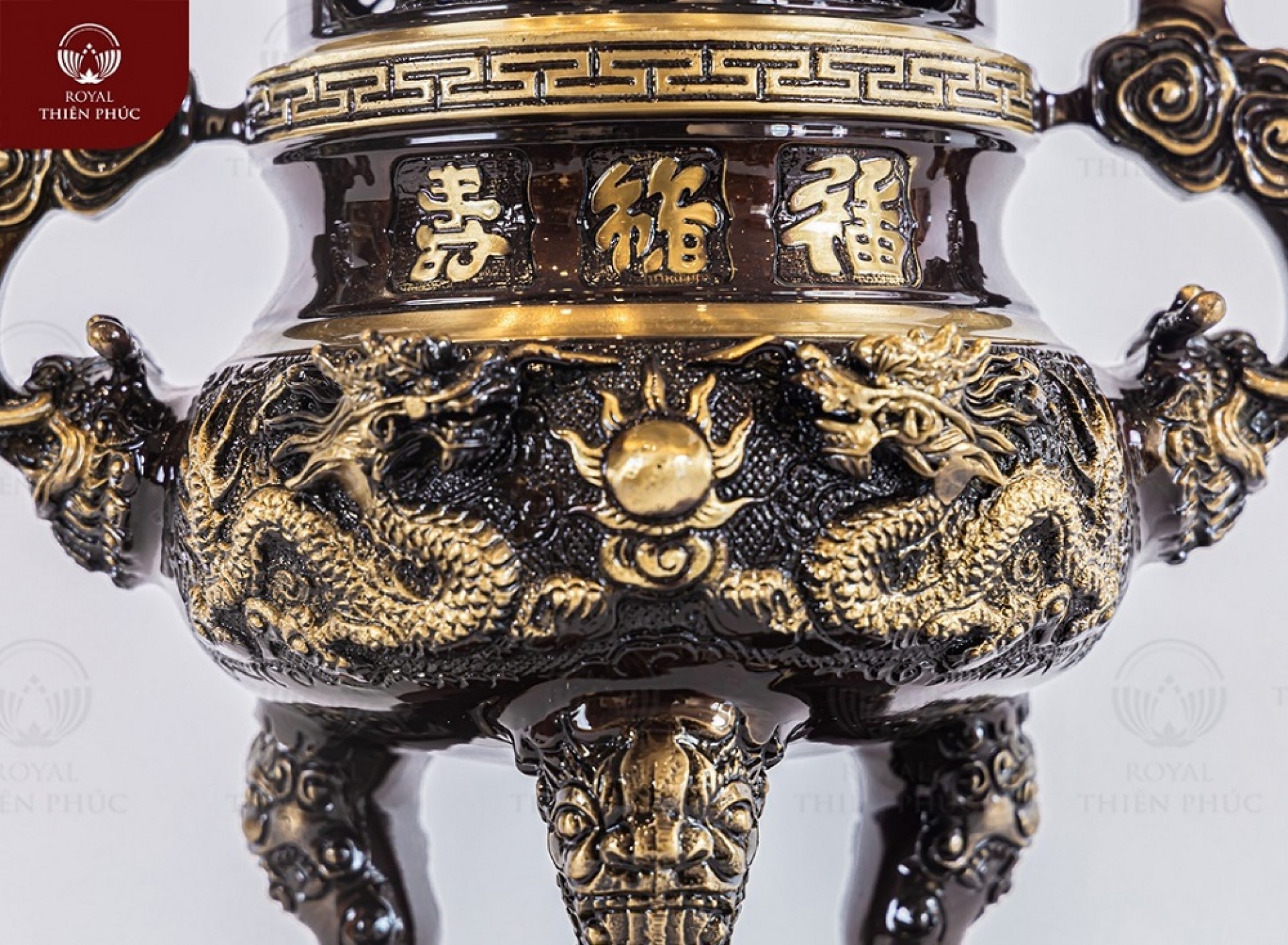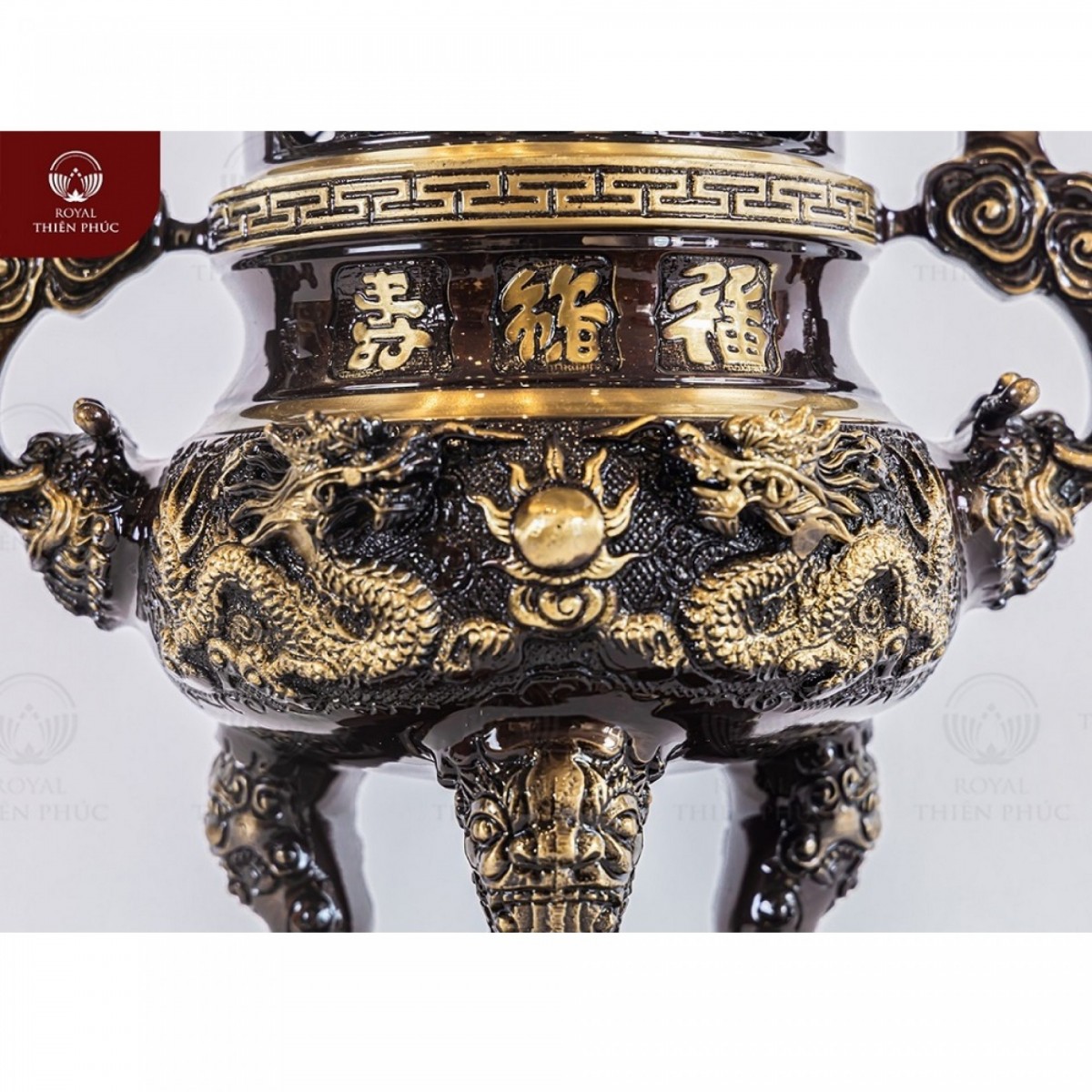 Thân đỉnh được chạm nổi ba chữ Phúc Lộc Thọ. Các Hán tự này càng thêm sinh động với nghệ thuật thư pháp. Mặt trước của bầu đỉnh thực sự cuốn hút với cảnh tượng song long chầu nguyệt. Vầng nguyệt tỏa sáng, bên dưới có áng mây bồng bềnh. Hai con rồng đưa bàn chân đỡ lấy đám mây. Trong khi đó, mặt sau của sản phẩm được trang trí hình phượng hoàng. Đôi chim cùng sải cánh và nhìn về một hướng. Sản phẩm là đỉnh đồng vàng hai lai quai mây. Chi tiết rồng phun mây đặc biệt ấn tượng!