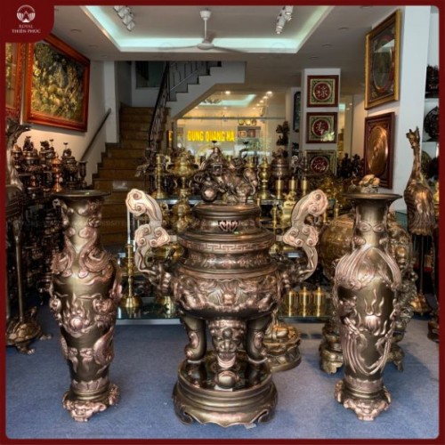 Đỉnh đồng và đôi lọ lộc bình chạm rồng phượng cao 1m2