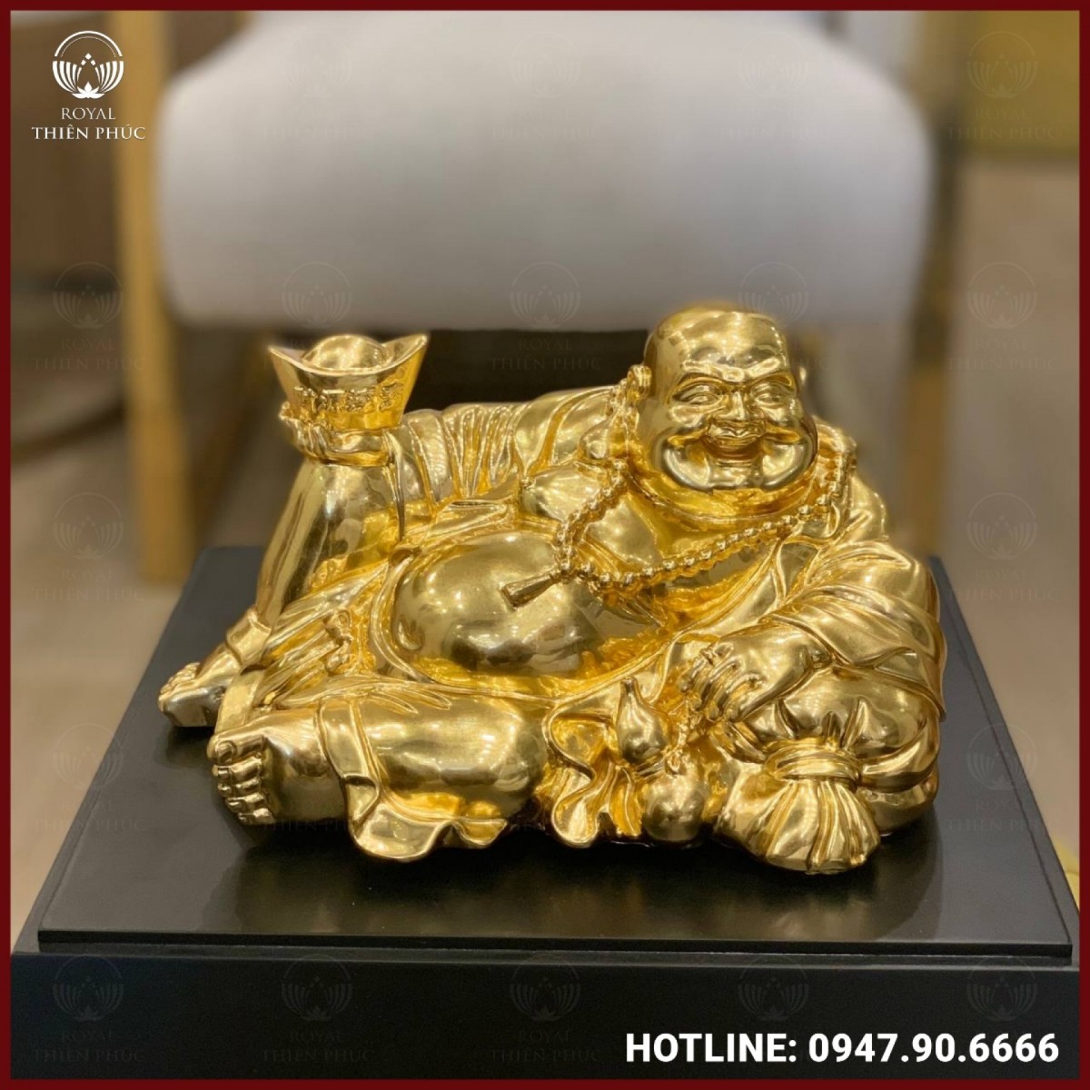 Tượng Phật Di Lặc được thể hiện trong tư thế nằm nghiêng thư thái, tay trái chống nhẹ nâng đầu, tay phải giơ cao một thỏi vàng lớn với nét mặt rạng rỡ niềm vui. Toàn thân Ngài toát lên vẻ hiền hậu và hỷ lạc, từ nụ cười đến ánh mắt đều mang đậm sự an lạc và hạnh phúc. Chiếc bụng tròn đặc trưng được phô bày, tượng trưng cho sự bao dung và lòng độ lượng vô bờ. Đặc biệt, bên cạnh Ngài là một hồ lô giữa túi vải, tạo điểm nhấn mềm mại và tinh tế cho toàn bộ tượng.