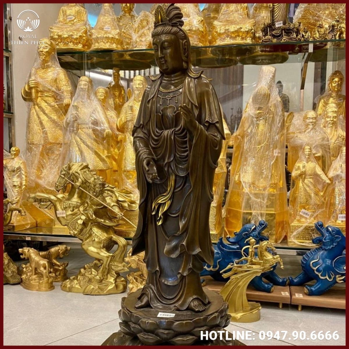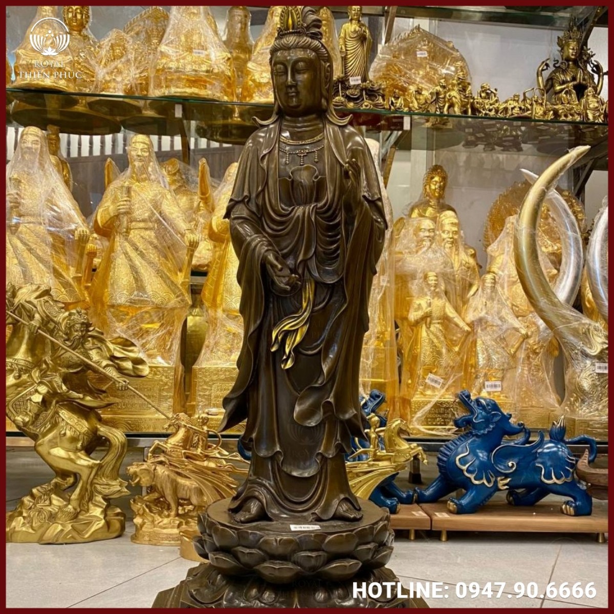 Tượng Phật Quan Âm mang trong mình thông điệp lớn lao về lòng từ bi và sự cứu độ vô biên. Hình ảnh Ngài đứng trên đài sen chính là biểu tượng của sự thanh tịnh, vượt qua mọi bụi trần để soi sáng và dẫn dắt chúng sinh thoát khỏi khổ đau. Đôi tay của Ngài với cử chỉ nhẹ nhàng thể hiện sự che chở, an ủi và xoa dịu mọi nỗi lo toan trong cuộc sống. Khi thờ Quan Âm trong nhà hay tại nơi thờ tự, người ta tin rằng Ngài sẽ ban phúc lành, mang đến sự an ổn, hóa giải tai ương và đưa đến hạnh phúc bền lâu. Tượng Quan Âm cũng nhắc nhở con người sống hiền hòa, giữ tâm thiện lành, biết sẻ chia và giúp đỡ những người xung quanh. Nhờ vậy mà cuộc đời mỗi người trở nên nhẹ nhõm hơn, lòng thanh thản hơn, và không gian thờ phụng cũng trở nên linh thiêng, tràn đầy năng lượng bình an.